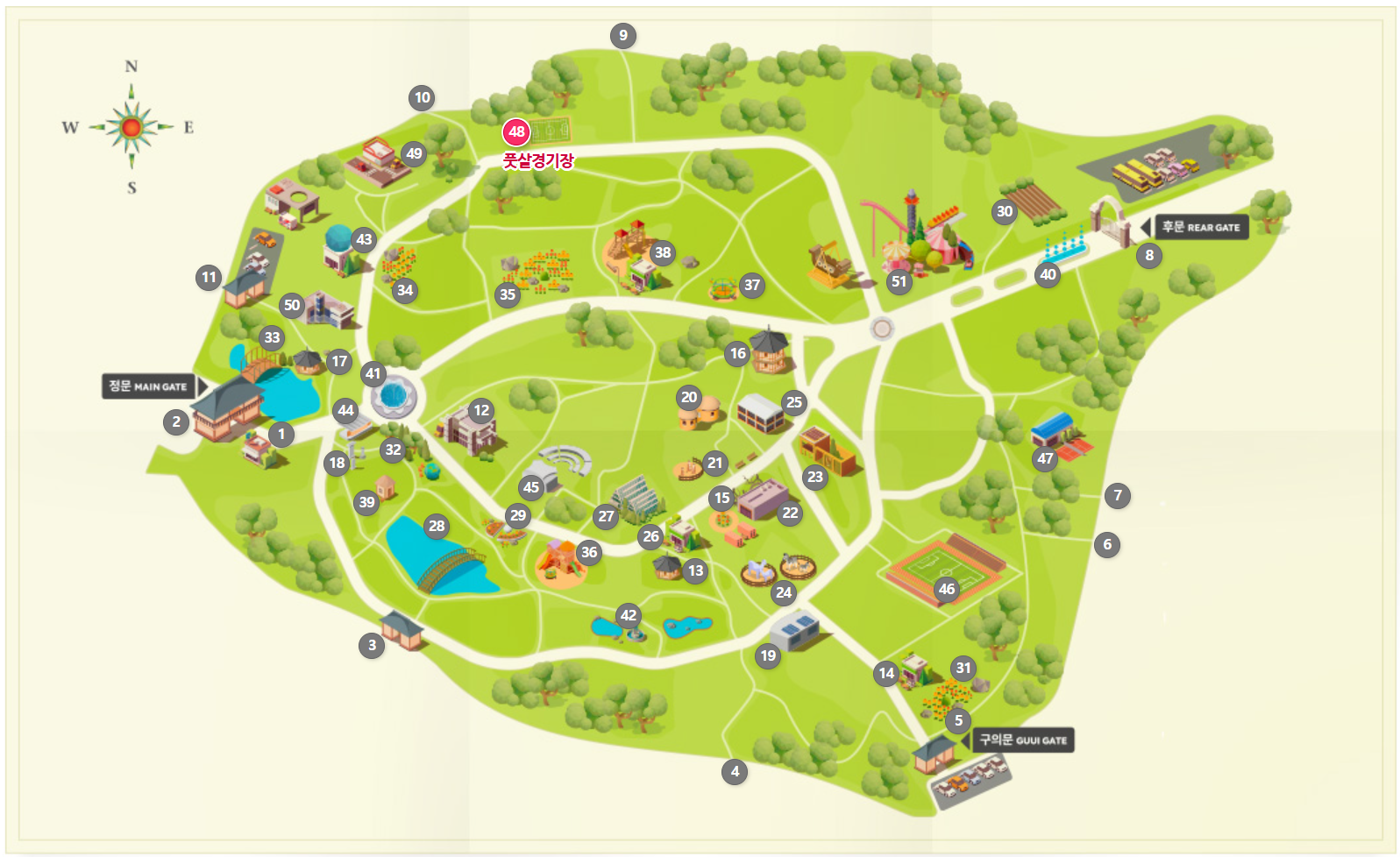 어린이대공원 내 위치하며, 대중교통(5호선 아차산역 3번 출구 도보 7분, 7호선 어린이대공원역 2번 출구 도보 23분)이나 공원 주차장 이용 후 도보 이동(약 10분) 가능합니다.