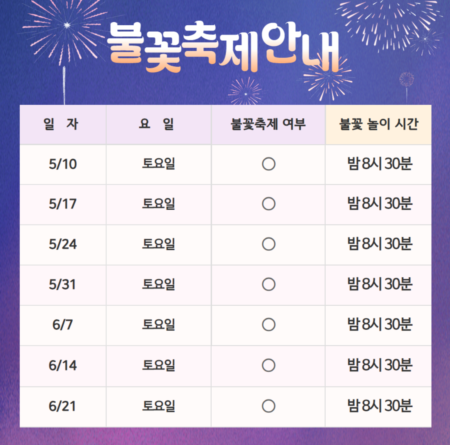 - 불꽃놀이 시간: 보통 밤 8시 또는 8시 30분 / 약 7~10분간 진행