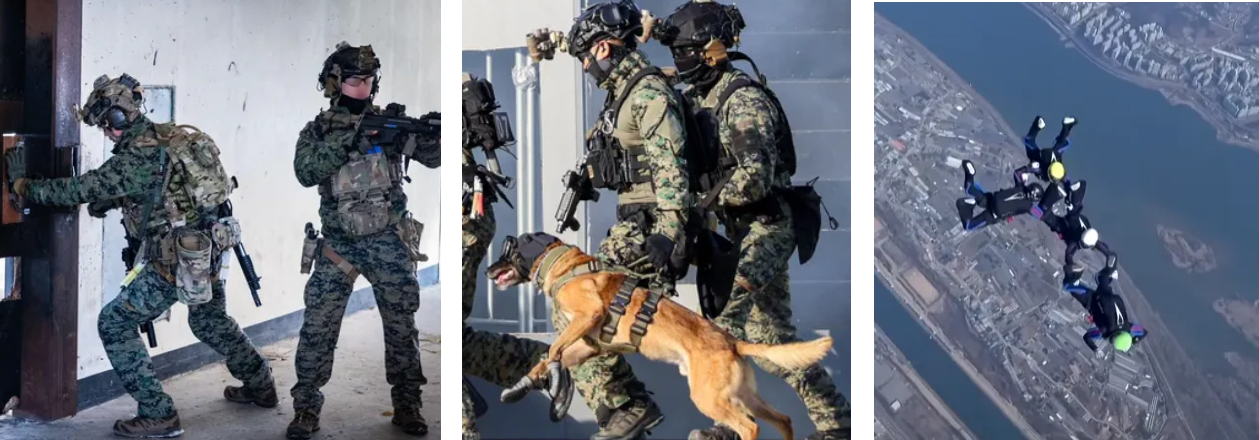 - 고공강하(낙하산), 수중 침투, 산악훈련, 전투수영, 인질 구조 전술